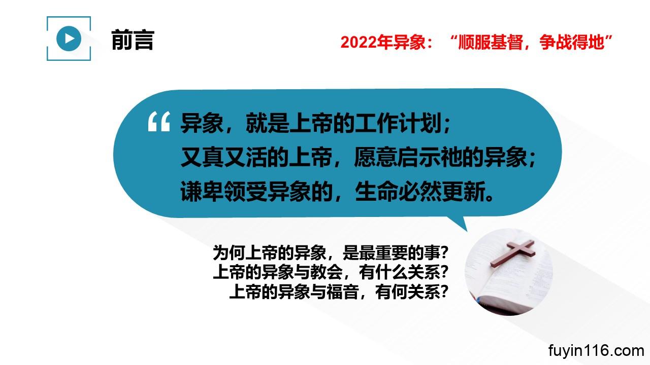“顺 服 基 督,争 战 得 地”,是主赐给我们2022年的异象。