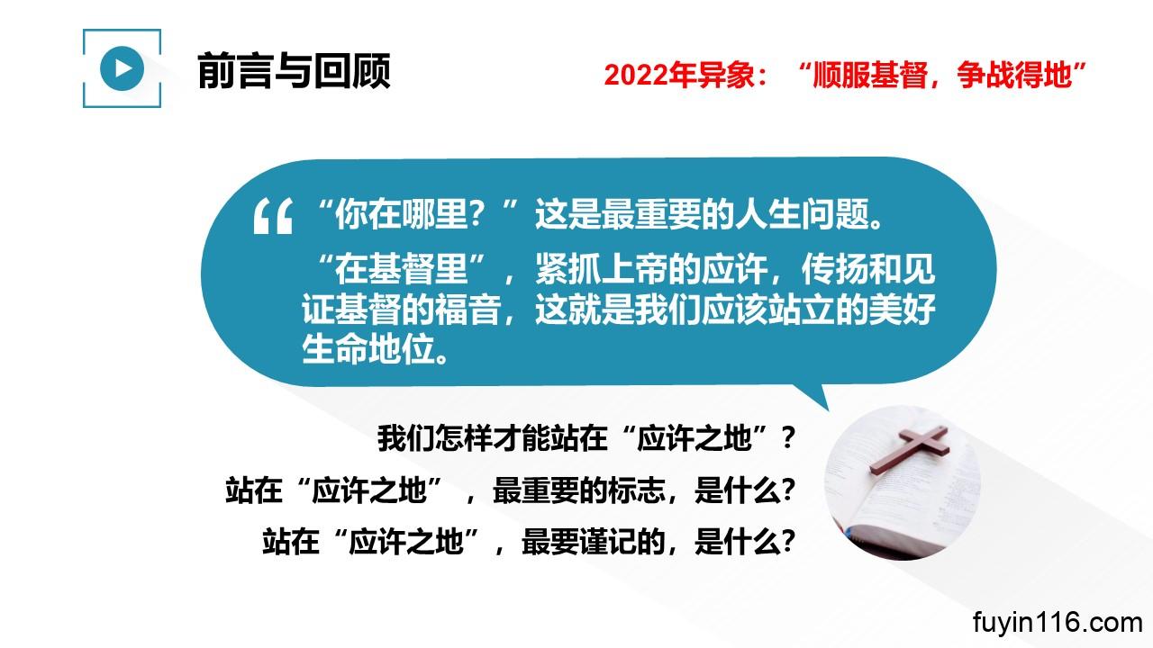 “顺 服 基 督,争 战 得 地”,是主赐给我们2022年的异象。