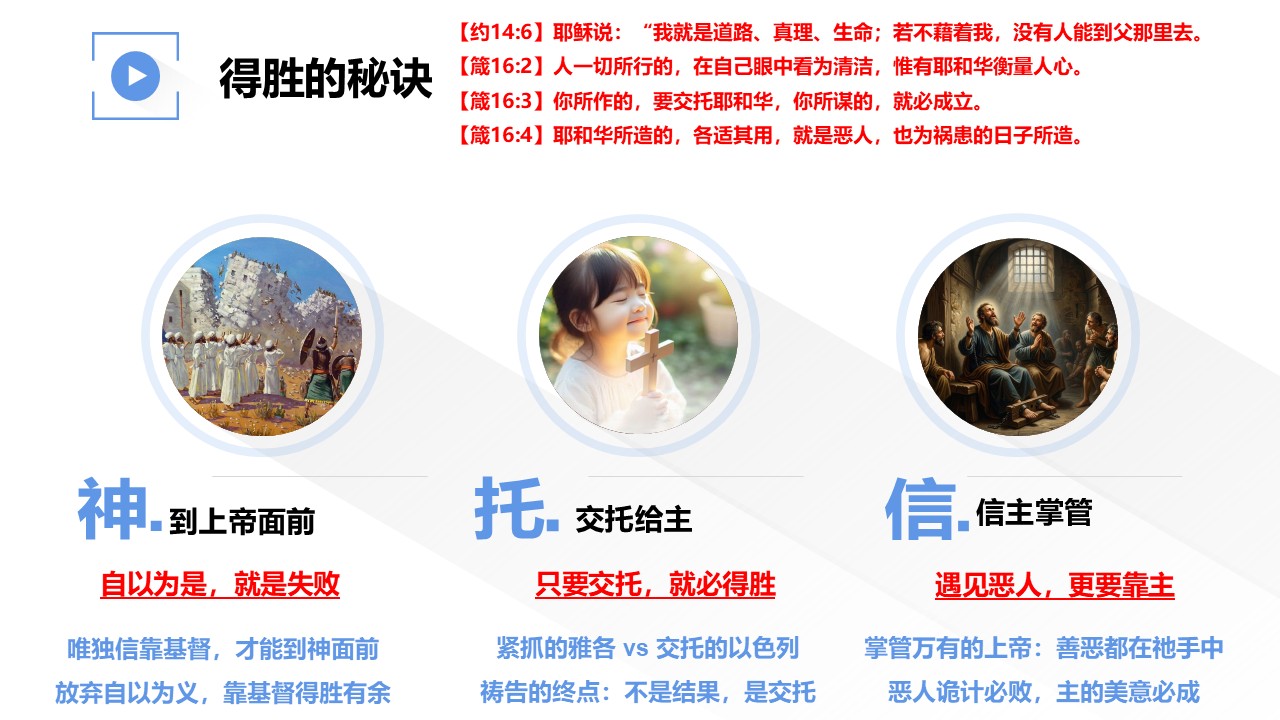 《箴言》16章2-4节,告诉我们得胜的三大秘诀,分别是什么?