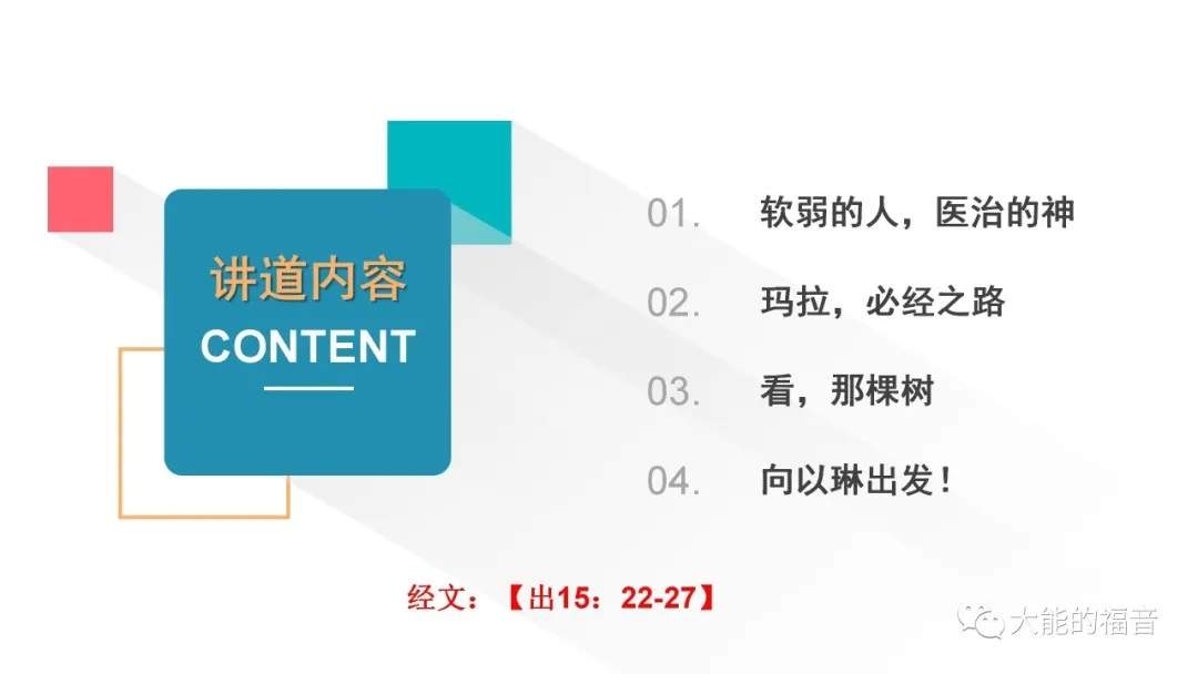 【出15:25】摩西呼求耶和华,耶和华指示他一棵树,他把树丢在水里,水就变甜了。耶和华在那里为他们定了律例、典章,在那里试验他们。
