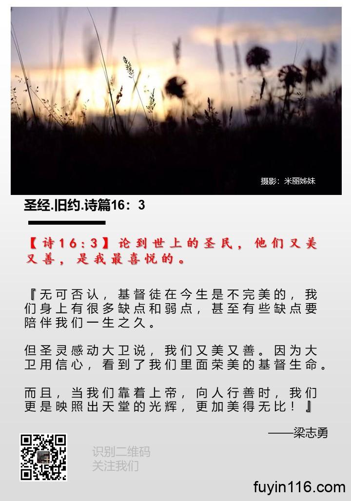 【诗16:3】论到世上的圣民,他们又美又善,是我最喜悦的。” 《是谁,又美又善?》 作者:梁志勇牧师 朗诵:徐辉姊妹 【诗16:3】论到世上的圣民,他们又美又善,是我最喜悦的。 『无可否认,基督徒在今生是不完美的,我们身上有很多缺点和弱点,甚至有些缺点要陪伴我们一生之久。 但圣灵感动大卫说,我们又美又善。 因为大卫用信心,看到了我们里面荣美的基督生命。 而且,当我们靠着上帝,向人行善时,我们更是映照出天堂的光辉,更加美得无比!』 主基督耶稣,感谢赞美你 感谢你把我们从罪恶中拯救出来,你称我们为义,并且…