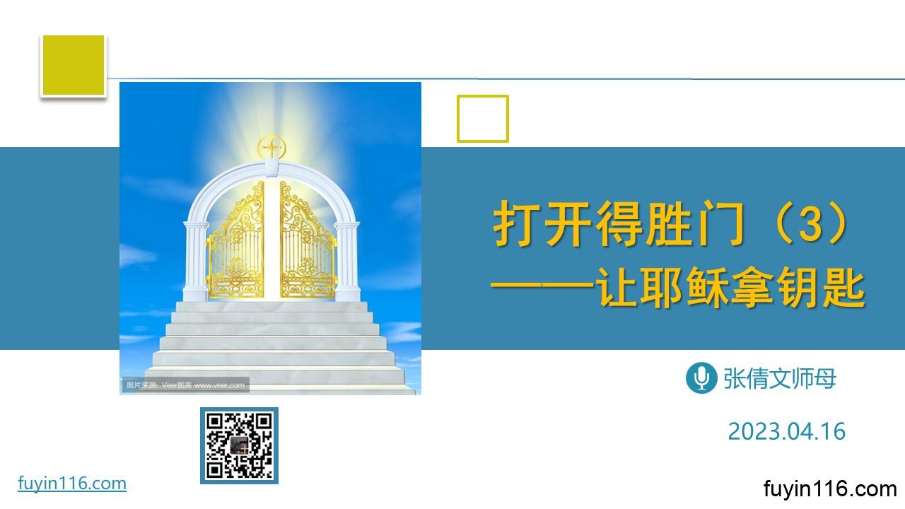 在4月16日,由倩文师母继续分享《打开得胜门》系列 《让耶稣拿钥匙》 愿上帝的祝福借着祂的真道,更多地临到每一个认真聆听的灵魂。 欢迎您跟着我们的文章的提示,参加我们的视频直播或收听我们的录音: 《让耶稣拿钥匙》 您也可以点击下面的链接,重温之前的信息: 《打开得胜门》系列等 点击音频媒体前面的小三角“►”就可以播放 我们的阿爸天父,感谢赞美你 感谢你赐给我们《圣经》真理,让我们可以领受你恩典和真理的祝福。 我们特别感谢你,赐给我们…
